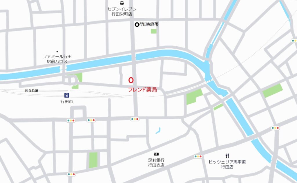アクセス 2026.01.30 秩父鉄道行田市駅より徒歩3分。北口階段を下りたらUターンして道なりにすすんでください。 税務署通りを左折してすぐ左側です。 駐車場完備。(4台駐車可能) 薬局内へのスロープがあるので、車いすでも大丈夫です。